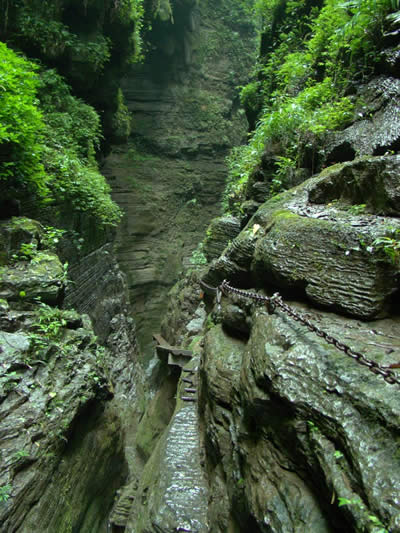 坐龍峽圖片 坐龍峽風(fēng)景區(qū)位于古丈縣河西鎮(zhèn),與“芙蓉鎮(zhèn)”--王村一水之隔。經(jīng)由300萬(wàn)年大自然的風(fēng)吹、水蝕而成,一直隱逸于湘西茫茫十萬(wàn)群山之中。它長(zhǎng)約3500米,最大高差達(dá)300余米;寬處不足丈余,窄處僅容一人通過(guò);谷內(nèi)絕壁縱疊,溪瀑橫懸,崖樹(shù)斜逸,異草遍坡。