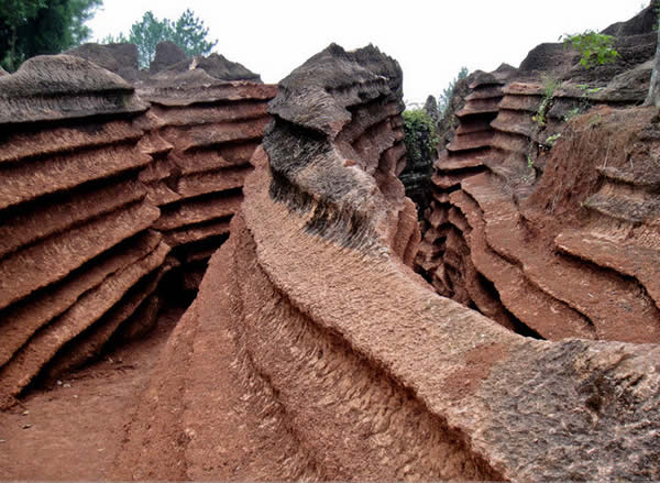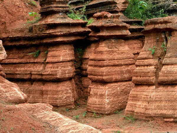 紅石林 告別船工后一切便突然安靜下來,過山谷的小路沒有人家,偶爾傳來幾聲清脆的鳥叫。穿過幾座隘口,峰回路轉(zhuǎn)后“石林”漸漸露臉,石頭的顏色是由灰白到棕紅,變幻而又使人聯(lián)想。間或一棵參天大樹,或是綠竹三兩棵,則又是另一番景致了。于高于低、于肥于瘦的石林,于石于樹、于濃于淡的色彩,顯得雄奇又雋秀,并透露出一種清靈飄逸。 這些石柱不但顏色各異,而且大小不等。有的高達七、八米,而有些則像半埋于地下的巨獸骨架。一位村民告訴記者,現(xiàn)在石林沒有以前壯觀,都長渣子(灌木)了。原因是由于山頂樹木減少,雨水將泥土帶下山,很多石頭都被埋在土下,后來這些地方都開墾了農(nóng)田,石林也被永久覆蓋。 由于泥土覆蓋,石林被切割成一個個小區(qū)域,有些隱蔽在果林中,而有些則像突然從天而降,散落田間。