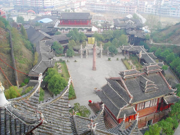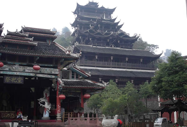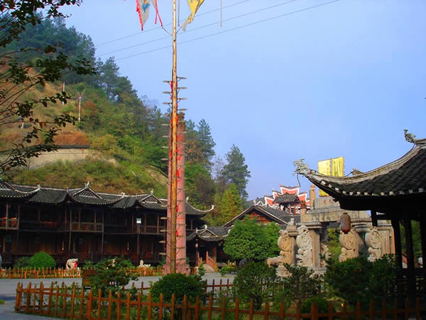 土司城 土司制度初建于五代十國時期,到了明朝己非常成熟了,土司王有無上的權威,在湘西有三大土司王分別是桑植土司向氏、永順土司王彭氏、慈利土司王張氏,其中又以永順溪州土司彭氏實力最強。其它土司王都為自己修建一座土司城,唯有彭氏分別在永定、永順修建了二座土司城。在永定的土司城內,彭氏為顯示其地位,修建了湘西最高的一座高達 48米,共12層的吊腳樓,整棟樓竟無一根鐵釘,堪稱土家吊腳樓建筑史上的奇跡,此樓于2002年9月被評為最高吊腳樓,榮獲世界吉尼斯之最,與此同時土司城內舉辦一千人參加表演的毛古斯舞蹈活動獲得圓滿成功,同時獲得世界吉尼斯之最。進入土司城,首先看到土司城迎賓儀式,土家漢子迎賓鼓,吹牛角、放沖,土家姑娘攔門歌,敬攔門酒,進入城內,在祭祀堂前舉行百人土家大祭祖活動,男女老少唱擺手歌、跳擺手舞,登世界最高的吊腳樓九重天,參觀土家族千百年來文化展示。到土家山寨,聽土家歌,賞土家族最有代表風俗哭嫁,三棒鼓,花燈等民俗表演。