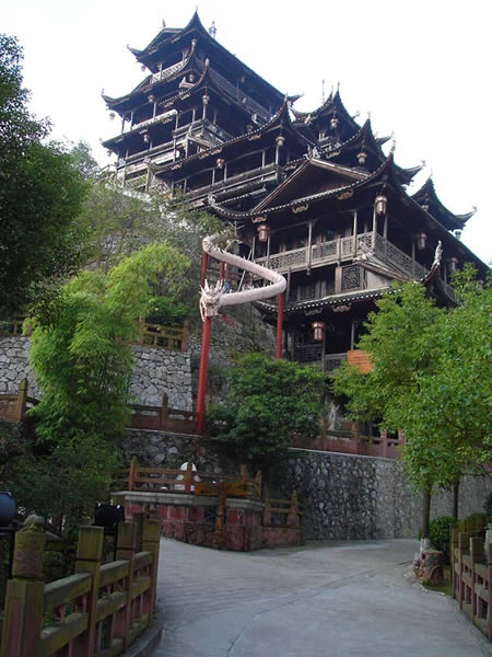 九重天 九重天世襲堂是土家風情園的精華和靈魂所在。該建筑由土家民間藝人李宏進設計,依80度陡坡而建,高48米,共9重12層,整個樓房全部用木栓連接,沒有一顆鐵釘,堪稱土家族建筑史上的奇跡。2002年9 月22日,九重天吊腳樓被載入世界吉尼斯世界紀錄,認定其為目前中國最大、最高、最完美的木質結構吊腳樓。2001年4月6日,朱镕基總理視察土家風情園時,對九重天贊不絕口:“一批民間匠人能造出這樣輝煌的吊腳樓,而且還解決了力學的問題,真是不簡單!鼻迦A大學著名建筑學家何重義先生說:“張家界土家風情園完全可以和蘇州的園林相媲美。特別是九重天世襲堂,猶如玉宇瓊閣,令人神往!”古人說,天有九野,地有九州,土有九山,山有九寨。古人又把九重叫做天,說天有九重,最上一重是上帝和君主居住的地方,所以我們叫它“九重天”。