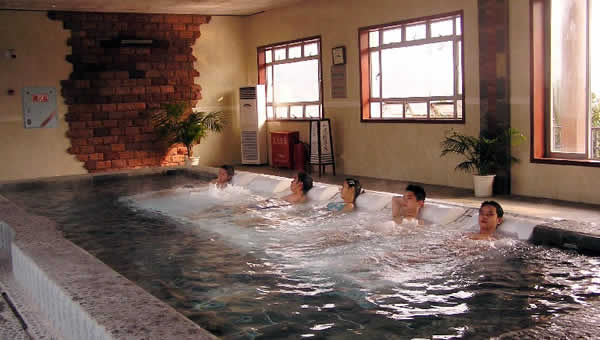 慈利縣江埡溫泉 最大的主溫泉池叫“同心泉”,形似一顆紅心,寓意同心同德,萬眾一心,眾志成誠。同心泉可供200人同時(shí)共浴,水溫38-41度,可躺可坐,沐浴其中,仰望藍(lán)天白云,遠(yuǎn)眺雄山奇峰,伴隨著典雅的鄉(xiāng)村音樂,周身便覺溫曖如春、愜意萬分。