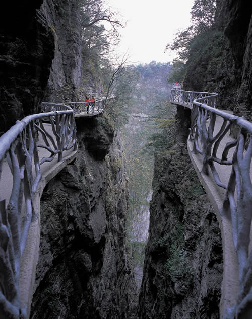 據(jù)施工人員介紹,此條棧道也是他們所修棧道中施工最難,最險(xiǎn)峻的一條。如果您還覺得不夠刺激的話,在棧道的完結(jié)處的兩個(gè)懸崖之間有一條長160米的懸索吊橋,同時(shí),在海拔最高點(diǎn)還有一個(gè)挑戰(zhàn)心里極限的玻璃站臺(tái),在這里,如果你能挺直腰板伸開雙臂,那么,您就是真正的勇士了。