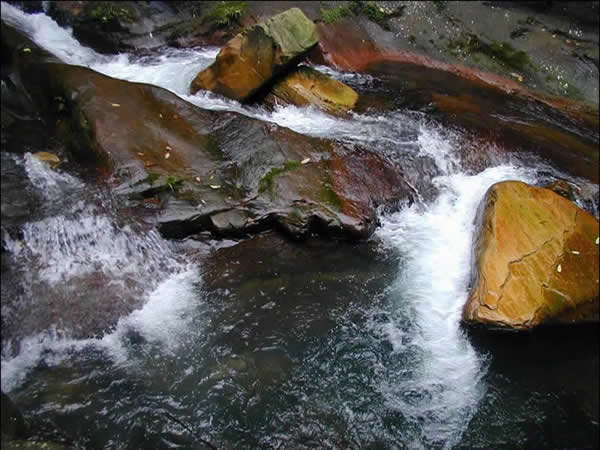 紫草潭位于張家界國家森林公園內(nèi),金鞭溪與砂刀溝匯合處。潭谷為紫紅色砂巖,因流水經(jīng)多次沖刷成槽狀,而名為紫草潭。潭長約8米,寬約2米,深2米。潭水清澈見底,加之因奇峰、綠樹、紫石映入潭底,斑駁陸離,水光鱗鱗,綠影搖曳,極為自然和諧。潭上小橋?yàn)橐粔K完整的天然巨石,三米多長,二米寬。