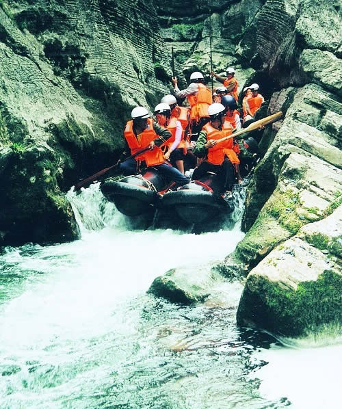 西門(mén)峽 西門(mén)峽漂流全程6公里,屬萬(wàn)溶江流域,它發(fā)源于兩頭羊自然保護(hù)區(qū)的群山之中;沿途危崖夾峙,樹(shù)木蔥榮,水質(zhì)清澈、急流、險(xiǎn)灘星落棋布。共有虎跳澗、白龍灘、臥龍灘、青龍峽、鬼見(jiàn)愁、龍王灘等急流險(xiǎn)灘30余個(gè)。其中以青龍灘最為著名,它全長(zhǎng)400米,落差20余米。它和龍王灘一道堪稱國(guó)內(nèi)漂流之經(jīng)典。