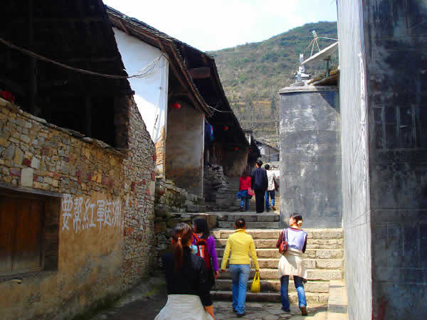 苦竹寨 賀龍?jiān)谏V哺锩鼤r(shí)期,幾乎踏遍了澧水兩岸的山山水水,村村寨寨?嘀裾清⑺叺囊蛔贁(shù)民族雜居的村落,保留了明清時(shí)的建筑特色,民風(fēng)淳樸,村民能歌善舞,許多桑植民歌都是靠苦竹寨的歌手流傳的。入夜的時(shí)候,苦竹寨亮起了盞盞紅燈,這是村里的一個(gè)傳統(tǒng)。當(dāng)年紅軍夜行軍過(guò)苦竹寨的時(shí)候,村里有個(gè)老婆婆怕紅軍夜黑路難走,便在家門(mén)口懸起了一盞紅燈,其它村民爭(zhēng)相效仿,苦竹寨成了一個(gè)燈的世界。這段軍民魚(yú)水情被寫(xiě)成了歌,傳唱到現(xiàn)在,這就是《門(mén)前掛盞燈》。