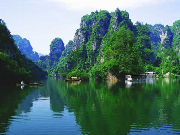 寶峰湖瀑布 湖中有兩座疊翠小島,近岸奇峰屹立,峰回水轉(zhuǎn)。泛舟漫游,只見一湖綠水半湖倒影,充滿詩(shī)情畫意!霸铺萑f(wàn)丈上天臺(tái),高峽平湖一鑒開,王母瑤池金扶,浣沙仙女下凡來(lái)”游寶峰湖,你就會(huì)欣賞到這樣的詩(shī)情畫意。群峰擁抱的寶峰湖,長(zhǎng)約2.,5公里,湖猶如一面寶鏡,四面青山,一泓碧水,蕩槳溫游,格外愜意。坐在船上,環(huán)顧四周,千山聳翠,俯視水中,倒影慢移,碧水照相館得群峰綠,人面桃花水映紅。真是靜極了,美極了!韓劇《九天洞》拍攝的湖水就是寶峰湖。