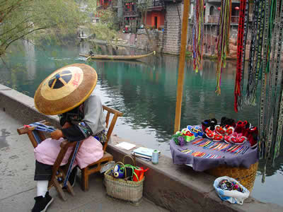 刺繡 刺繡。是土家姑娘在直紋平布上,按照布紋的經(jīng)緯和預(yù)先繪畫的花樣與底色不同的絲線繡成圖案。舊時(shí)姑娘們穿的繡花衣服,繡有服飾花邊、胸花、帽花,此外繡花枕頭、繡花荷包等也是精巧的手工工藝品。土家刺繡在配色上有自己的講究與習(xí)慣,一般選用青、藍(lán)、大紅等深色布料作底布,用淺色繡線制作圖案,或者相反,兩種用法的結(jié)果使繡品顯得質(zhì)樸逼真,色澤鮮艷,對(duì)比強(qiáng)烈。傳統(tǒng)圖案有“花開富貴”、“龍鳳呈祥”、“鴛鴦戲水”、“喜鵲鬧梅”、“松鶴同壽”等,分室內(nèi)、衣著、工具、行李裝飾等多種種類。在景區(qū),土家婦女邊繡邊賣的精美鞋墊,深受海內(nèi)外游客喜愛。
