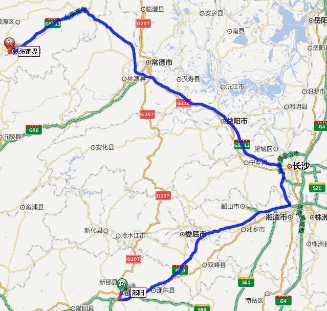 左右,沿途經過邵陽市——邵東縣——婁底——湘鄉(xiāng)——湘潭——長沙——益陽——常德——慈利——張家界。