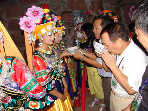 祝賀詞和答謝詞之后,主人把早已想好了的農(nóng)事或家事其日常生活的要事向來客提問,接謝人隨問隨答,然后由族長十分恭敬地雙手舉起盛滿包谷酒的酒杯,遞給一個(gè)年長客人,一碗一碗地讓客人們喝下這香醇美的包谷燒酒。一切儀式做完之后,說聲:“得罪了,最尊貴的客人”,客人答一聲“請(qǐng)不要客氣,我們都是一家人”。這時(shí),酒門大開,攔門人很禮貌地讓開一條道路恭迎客人進(jìn)屋。