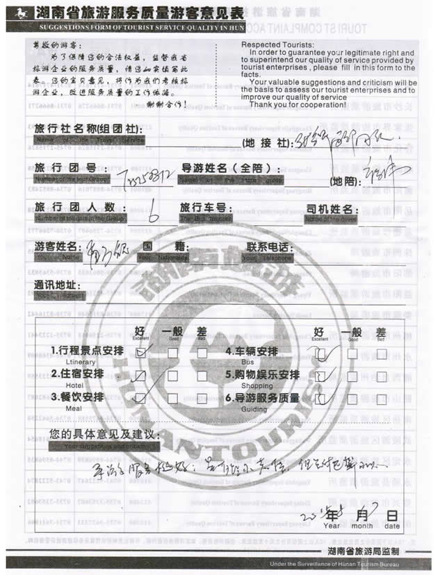 8月初,山西太原孟先生一行6位貴賓與湖南西部(張家界)中國(guó)國(guó)際旅行社工作人員——小吳取得聯(lián)系,經(jīng)過(guò)商談,雙方達(dá)成協(xié)議并簽訂旅游合同,于8月14日抵達(dá)張家界,開(kāi)始張家界之旅。此次行程是由我社優(yōu)秀導(dǎo)游——褚偉負(fù)責(zé)旅游接待工作,褚導(dǎo)在旅游過(guò)程中講解詳細(xì),客人也很滿意,在意見(jiàn)表上寫(xiě)道:導(dǎo)游服務(wù)挺好,謝謝周先生。同時(shí)也感謝周先生選擇湖南西部(張家界)中國(guó)國(guó)際旅行社,以及您對(duì)湖南西部國(guó)旅的信任與支持。我們會(huì)繼續(xù)努力,做好旅游接待工作。期待下一次與您的合作,祝您愉快!