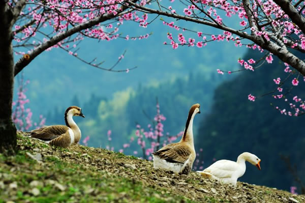 桃之夭夭,灼灼其華。據(jù)了解,天子山這處桃花仙境位于神堂灣至大觀臺之間的一農(nóng)場山丘內(nèi),面積足有一百畝以上。由于該地段剛好處于天子山至高點(diǎn),因此極目遠(yuǎn)眺,峰林風(fēng)光、桃花美景盡收眼底。而盡管農(nóng)場,則是一派鄉(xiāng)村田園風(fēng)情,一群雞鴨鵝不時(shí)穿梭在桃樹林內(nèi),一邊尋覓食物,一邊享受春光;看家護(hù)院的小黃狗迎接游客的熱情叫聲,讓人頓生回歸鄉(xiāng)愁之感。