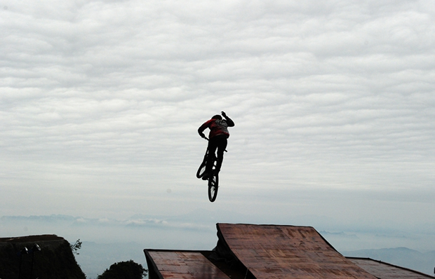 張家界天門山天門洞,999級(jí)臺(tái)階,以39°斜坡筆直往下,看一眼都覺得眩暈。如果有人騎著山地車一路沖下來,你一定會(huì)說“瘋了!”。