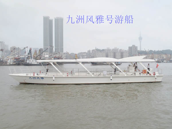 “九洲風(fēng)雅”號游船:船長23.08米,寬5.03米,擁有80客位。此船造型簡約,有很強(qiáng)的時(shí)尚設(shè)計(jì)感,與馬爾代夫的游船同款。