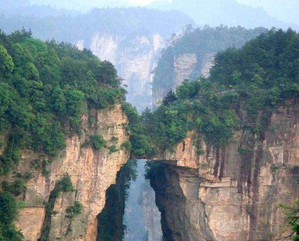 “后花園”至天下第一橋,有一條全長(zhǎng)2000多米的游道,路面多為白色的條石鋪成,站在遠(yuǎn)處觀望,很像一條白色的綢帶打了兩個(gè)結(jié),一頭系在“迷魂臺(tái)”,一頭第在“天下第一橋”。信步漫游,沿途可欣賞到“拜仙臺(tái)”、“百丈絕壁”、“小洞天”、“情人谷”等別有情趣的景點(diǎn),這里海拔不高,一般不受氣候影響,慢慢品味,定會(huì)使您賞心悅目!疤煜碌谝粯颉笔菑埣医纭笆蠼^景”之一。也是袁家界的標(biāo)志性景點(diǎn),它是居于兩山之間形成的一座天然石橋,而兩山原為一體,橋身是兩山相連的關(guān)鍵部分,但因中間石質(zhì)較為薄弱,由于風(fēng)化、崩塌作用的影響,又經(jīng)過日曬雨淋、流水洗刷、山洪沖擊,久而久之,終于形成今天這一特別的奇景……。自杉刀溝上袁家界,沿絕壁頂部邊緣遨游,至于中坪“觀橋臺(tái)” 遙望千米之外,只見一天然石橋凌空飛架兩峰之巔,氣勢(shì)磅礴,奇?zhèn)ソ^倫,被稱為“天下第一橋”。石橋?qū)拑H3米,厚5米,跨度約50米,相對(duì)高度近400米。天下第一橋與夫妻巖并稱“張家界雙絕”!疤煜碌谝粯颉睒蛎鎸拑擅,厚四米,跨度為二十多米,高度為三百多米,是世界是迄今為止所發(fā)現(xiàn)落差最高的天然石橋。