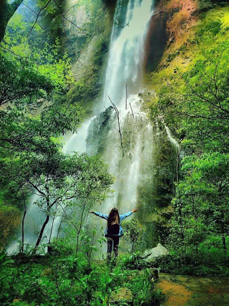 杉刀溝盡頭,有一抹泉水從200多米高的崖頂飄然而下,仿佛一匹白色長(zhǎng)練自天而降。飛瀑下臨深潭,綠水泱泱,水霧漫漫,睛雨交加之日,時(shí)有彩虹飛升。每當(dāng)山洪瀑發(fā),瀑布猶如一巨龍,飛騰傾瀉,聲若巨雷,蔚為壯觀。