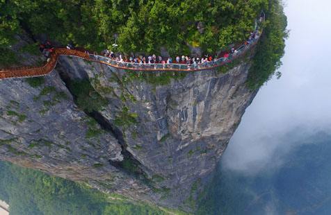 站在棧道上俯瞰群山,古人“會(huì)當(dāng)凌絕頂,一覽眾山小”的感覺油然而生。由于天門山是國(guó)家森林公園,植被特別豐富,加上典型的喀斯特地貌,所以,在這條棧道上更能找到一種在乘坐直升飛機(jī)飛越熱帶雨林大峽谷的感覺,這平時(shí)只能在電影里看到的場(chǎng)景,在這里能讓你身臨其境。