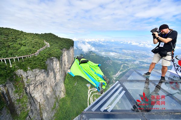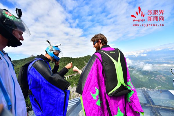 2017世界翼裝飛行世錦賽將于9月8日-10日在張家界天門山舉辦。開(kāi)賽在即,9月7日上午,來(lái)自全球11個(gè)國(guó)家的16名翼裝飛行員從海撥1458米的張家界天門山玉壺峰頂一躍而下,在奇峰險(xiǎn)壑間進(jìn)行競(jìng)速訓(xùn)練。