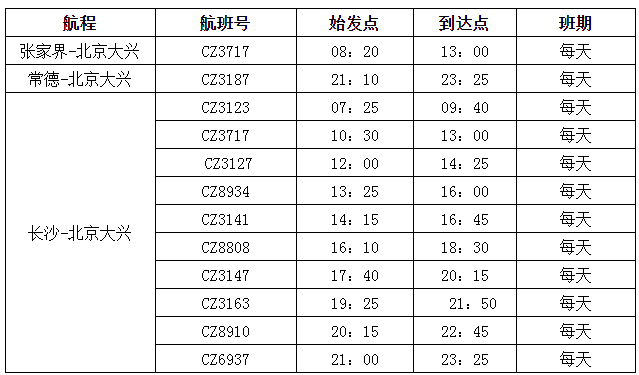 南航冬春換季后還全面優(yōu)化了各地往返北京大興的航線網(wǎng)絡(luò)。其中,張家界至北京大興航班為每天一班的朝發(fā)夕歸航班,去程CZ3717(張家界-大興)航班08:20張家界出港,回程CZ3164(大興-張家界)航班17:50北京大興起飛,時刻非常方便出行,張家界始發(fā)至大興單程僅450元起(不含稅)。常德每天往返北京大興1班;長沙每天往返大興10班(2班為寬體機),均提供“精品航線”服務(wù)。此外,北京大興往返廣州、深圳、上海、長沙、貴陽、珠海、?、三亞、哈爾濱、大連、杭州、重慶、西安、烏魯木齊等全國主要城市均為早中晚全天候航班布局,方便旅客航空出行和中轉(zhuǎn)銜接。
