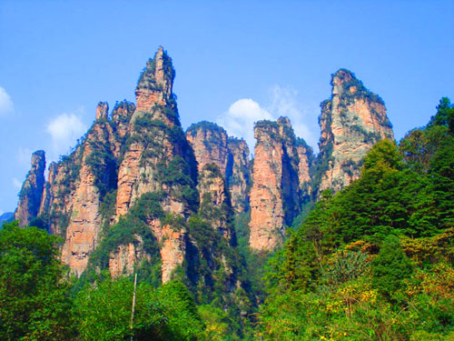 下 午:可選擇步行(步行下山一般時間為2小時左右)或者乘坐天子山索道(索道票72元/人自行購買)下山,游覽巧奪天工的--【十里畫廊】,可以選擇步行或者乘坐觀光小火車游覽十里畫廊(觀光小火車票單程38元/人自行購買),沿途欣賞天臺三姐妹峰、向王觀書、黃昏戀、壽星迎賓、采藥老人、錦鼠觀天、猛虎嘯天等景點;